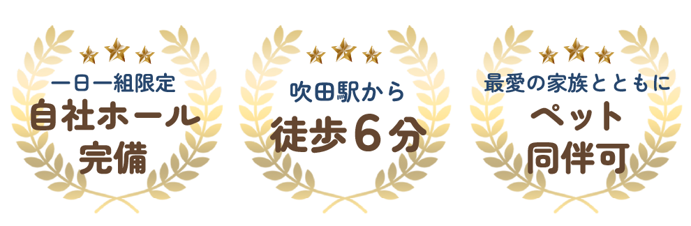 家族葬みかづきは、JR吹田駅から徒歩6分の場所に、自社ホール「家族葬みかづき JR吹田駅前ホール」を構えています。プライベート感を大切にしたいご家族様にとって理想的な空間で故人様に想いを届けることができます。