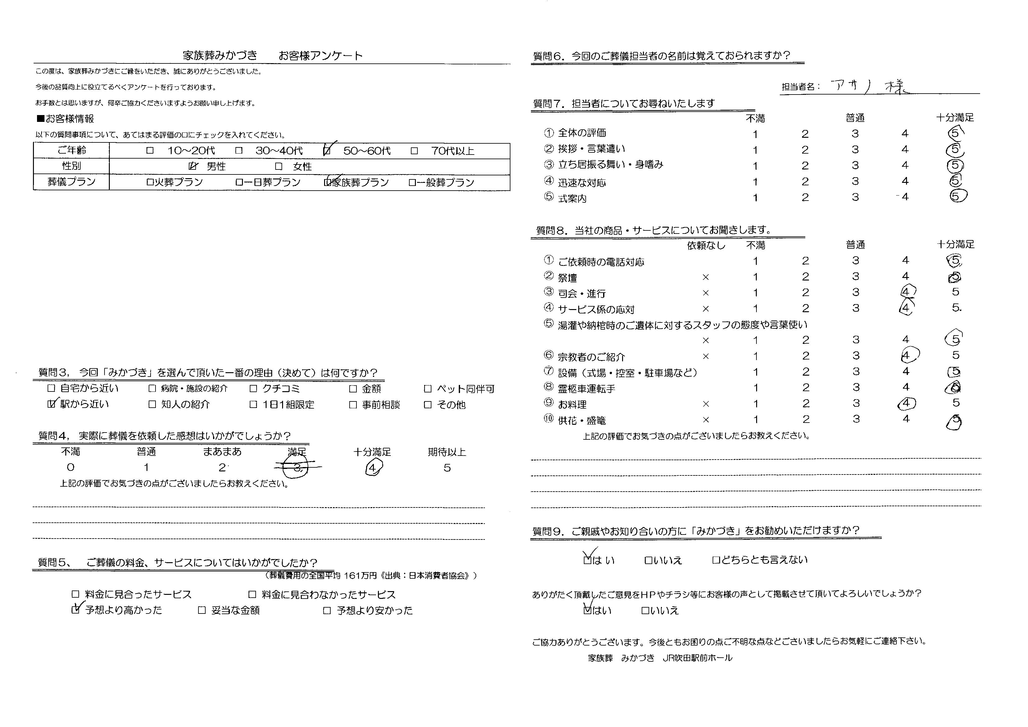 家族葬みかづきでは、葬儀を終えられたご遺族の方にアンケートにご協力いただき、より良いサービスの提供に努めております。