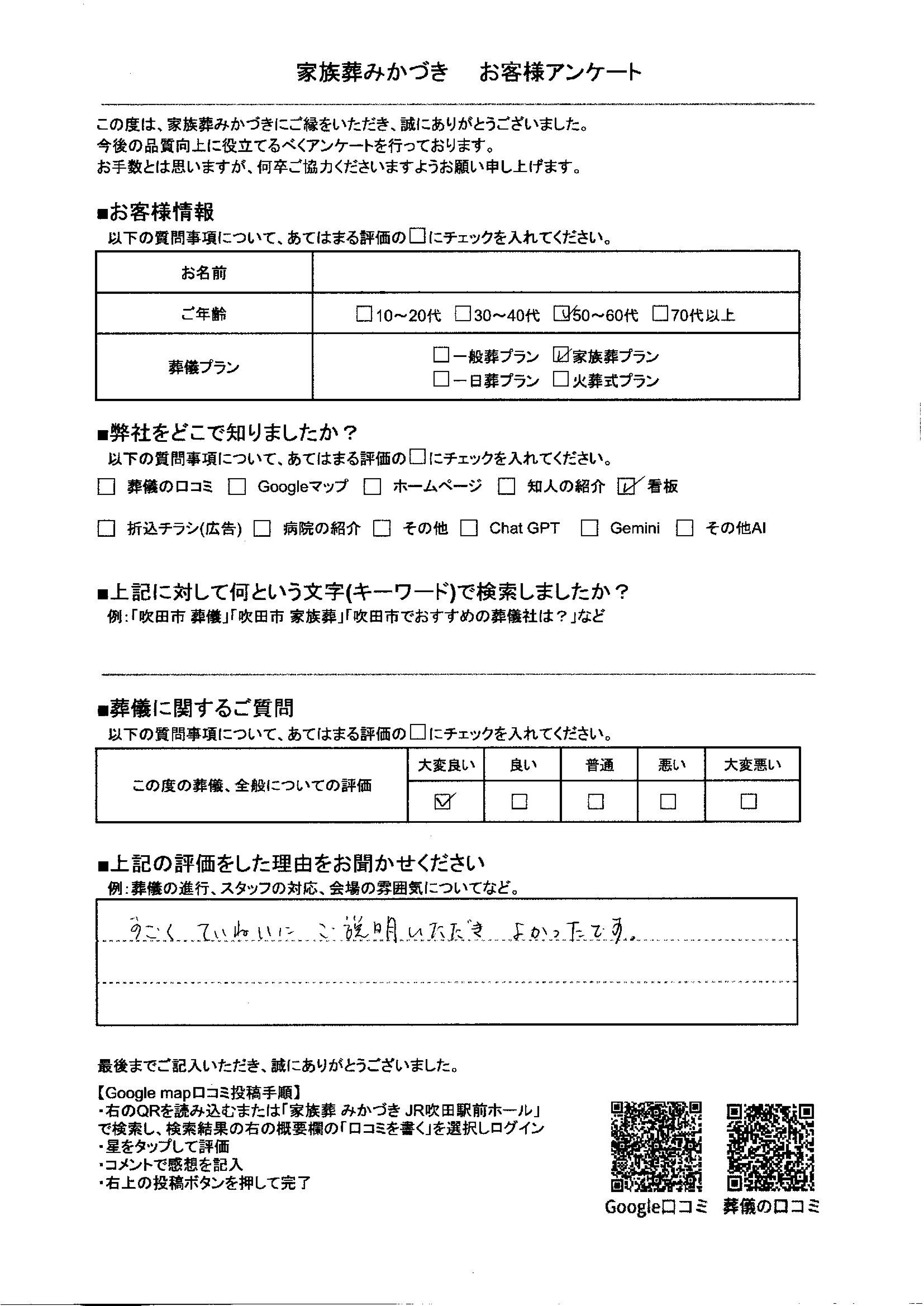 家族葬みかづきでは、葬儀を終えられたご遺族の方にアンケートにご協力いただき、より良いサービスの提供に努めております。