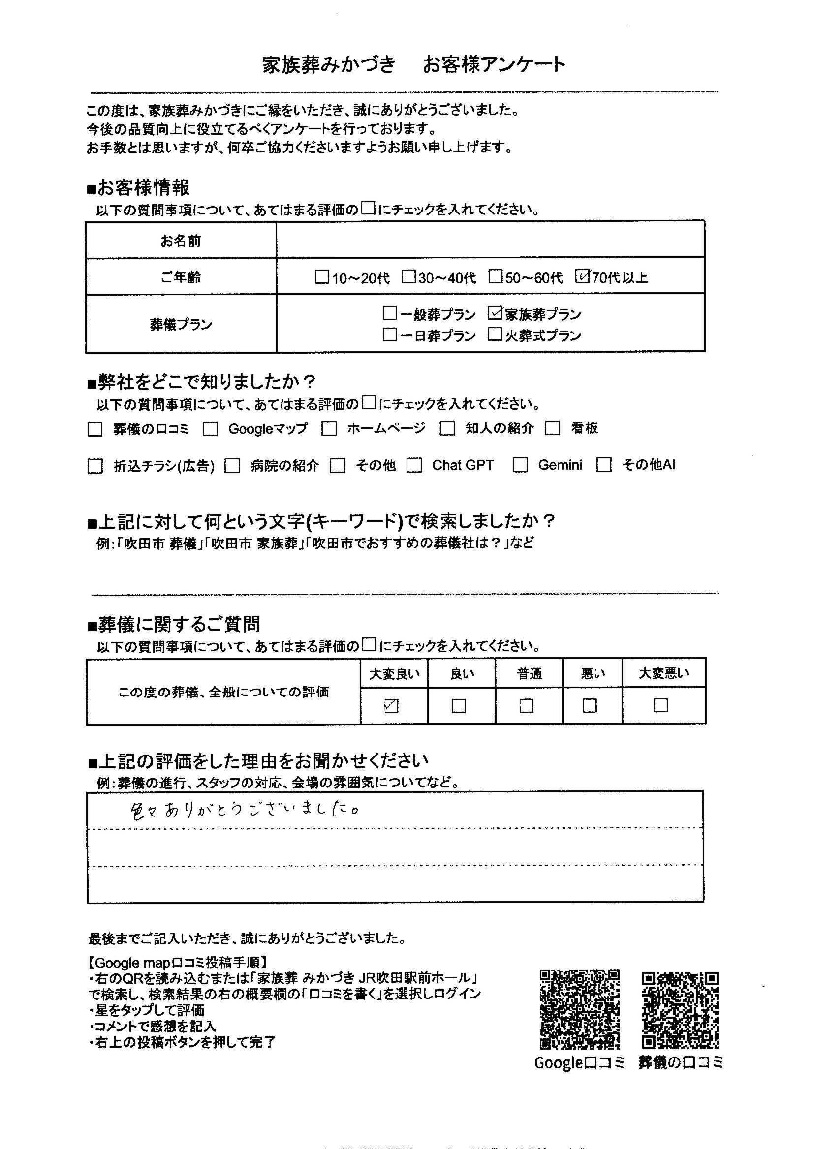 家族葬みかづきでは、葬儀を終えられたご遺族の方にアンケートにご協力いただき、より良いサービスの提供に努めております。