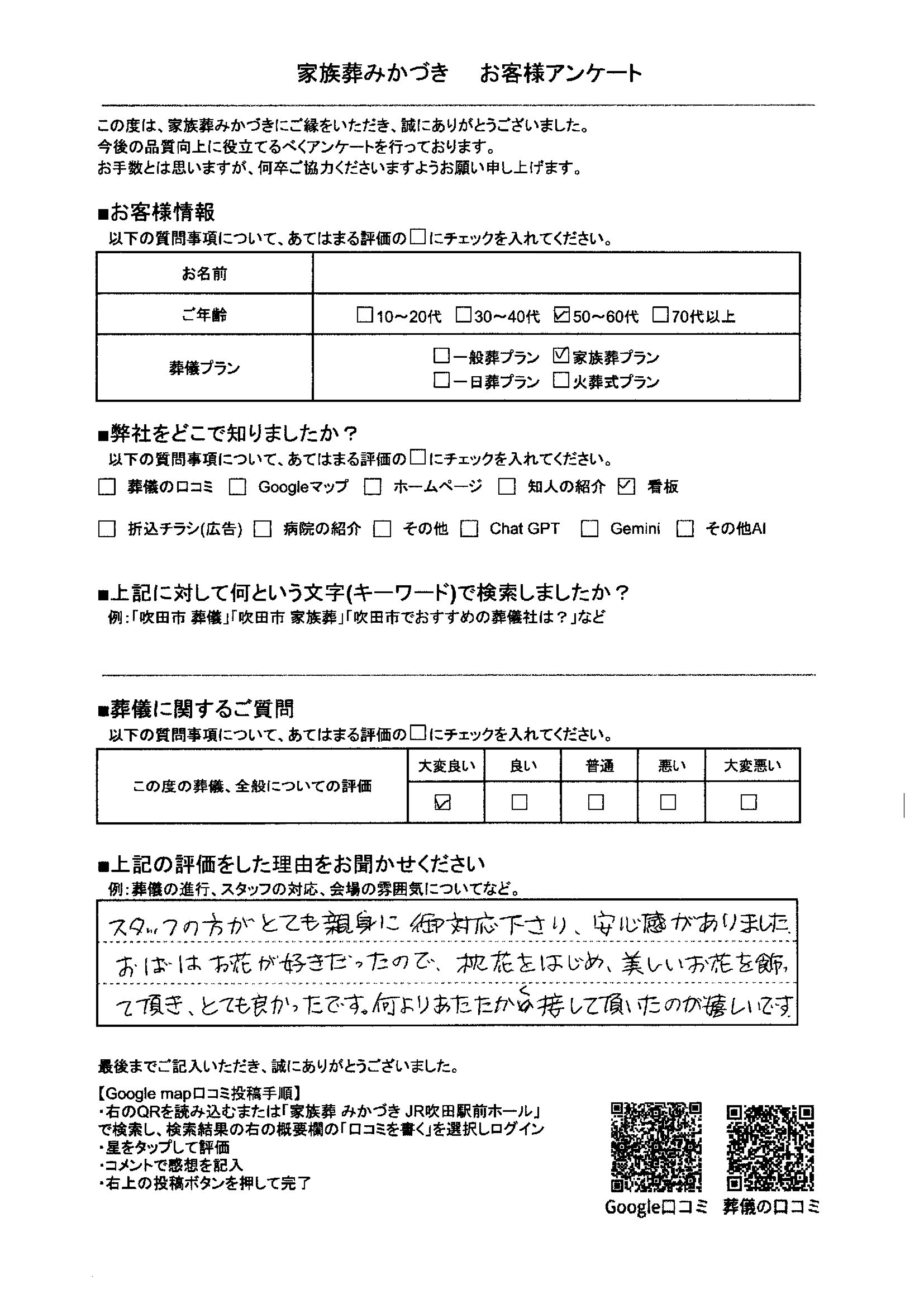 家族葬みかづきでは、葬儀を終えられたご遺族の方にアンケートにご協力いただき、より良いサービスの提供に努めております。