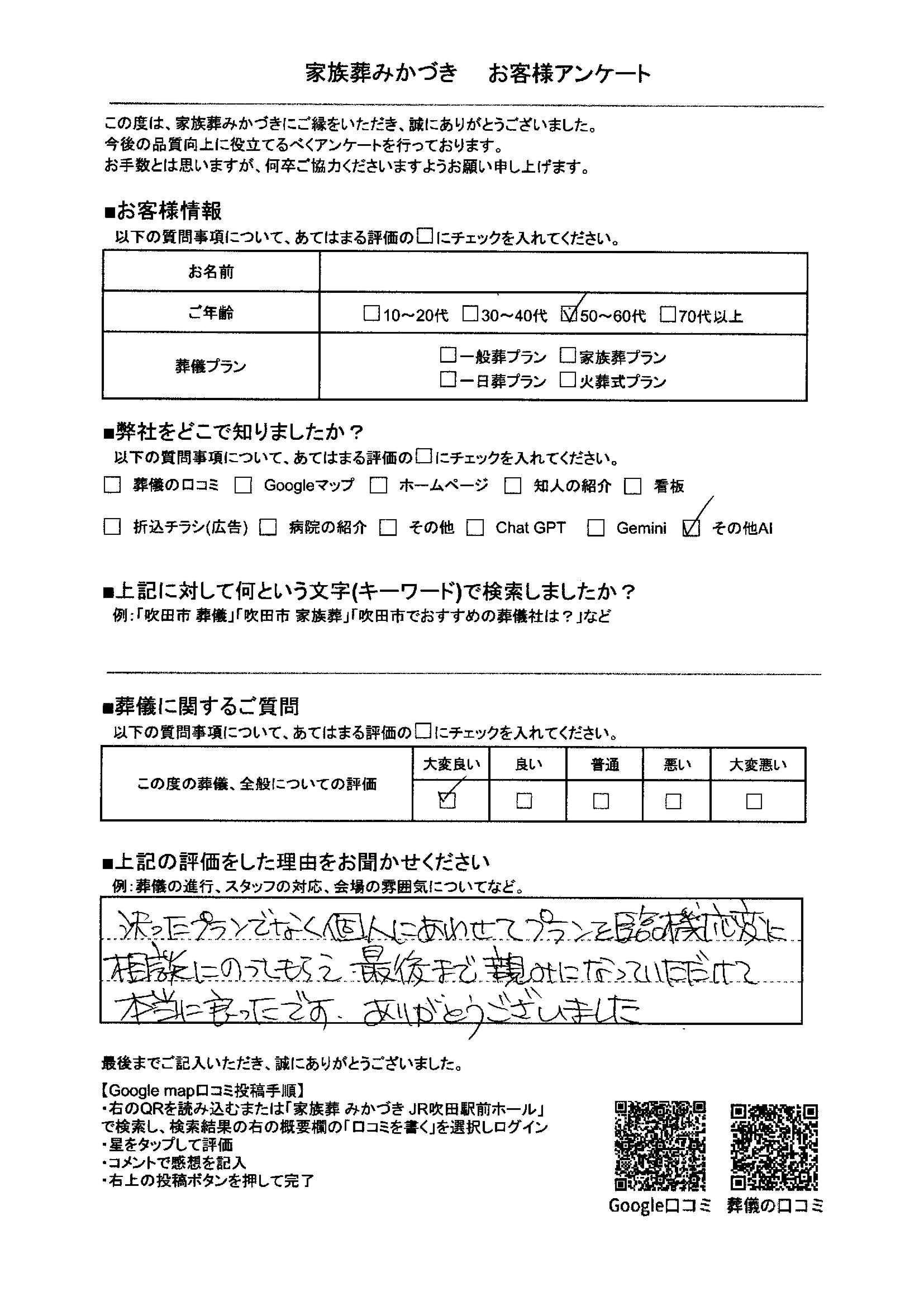 家族葬みかづきでは、葬儀を終えられたご遺族の方にアンケートにご協力いただき、より良いサービスの提供に努めております。