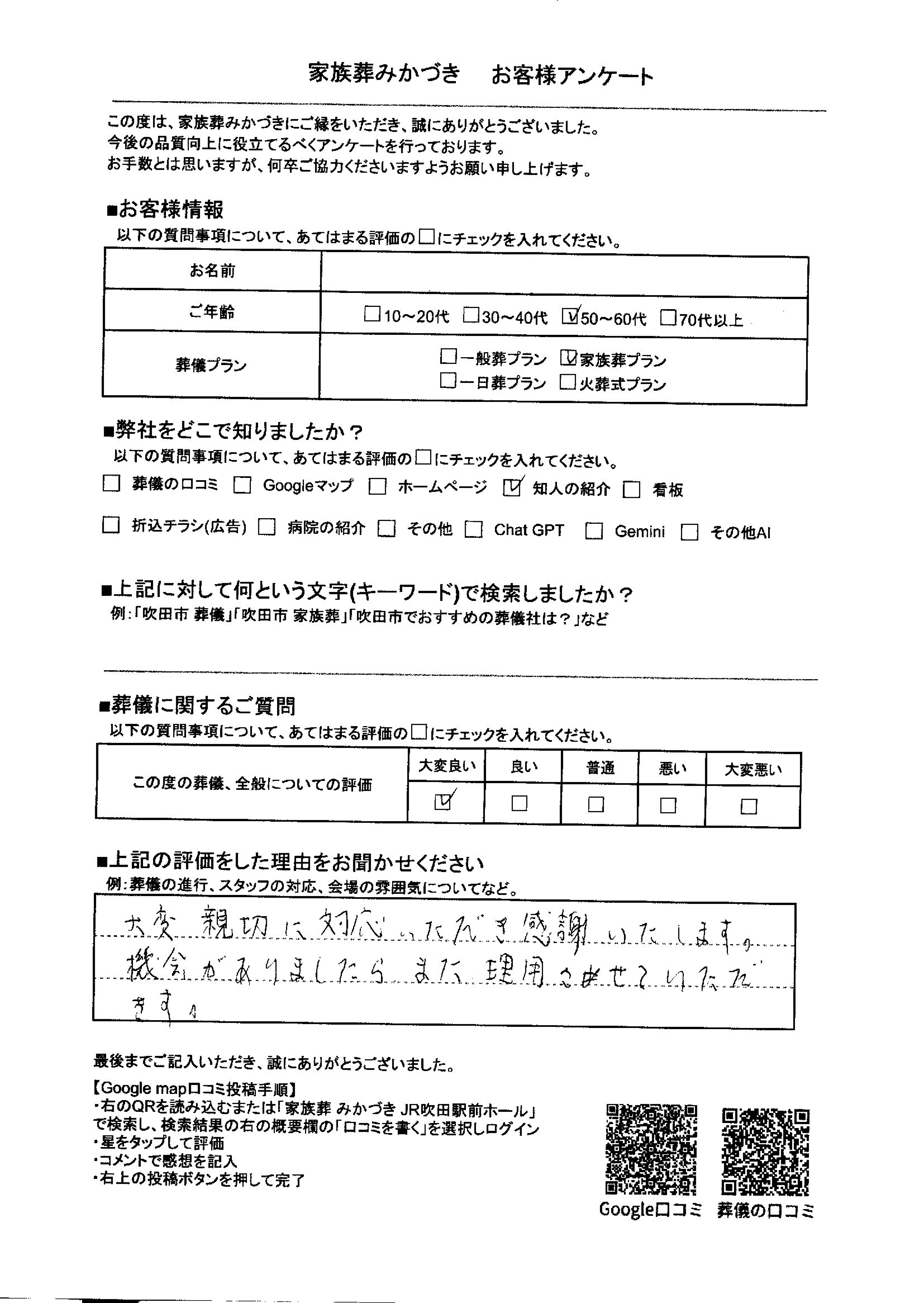 家族葬みかづきでは、葬儀を終えられたご遺族の方にアンケートにご協力いただき、より良いサービスの提供に努めております。