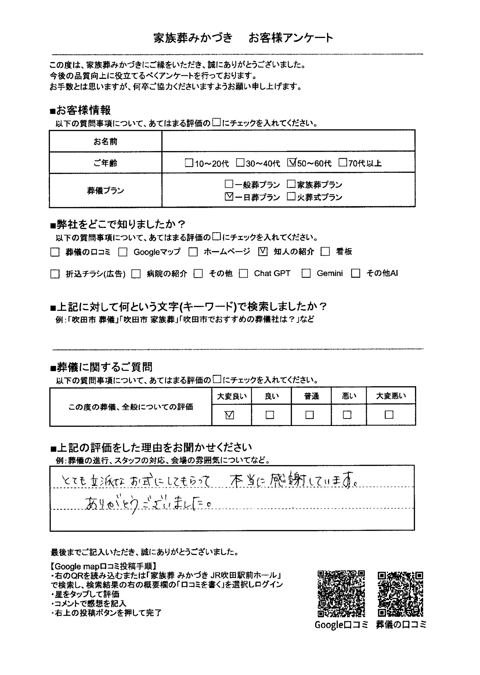 家族葬みかづきでは、葬儀を終えられたご遺族の方にアンケートにご協力いただき、より良いサービスの提供に努めております。
