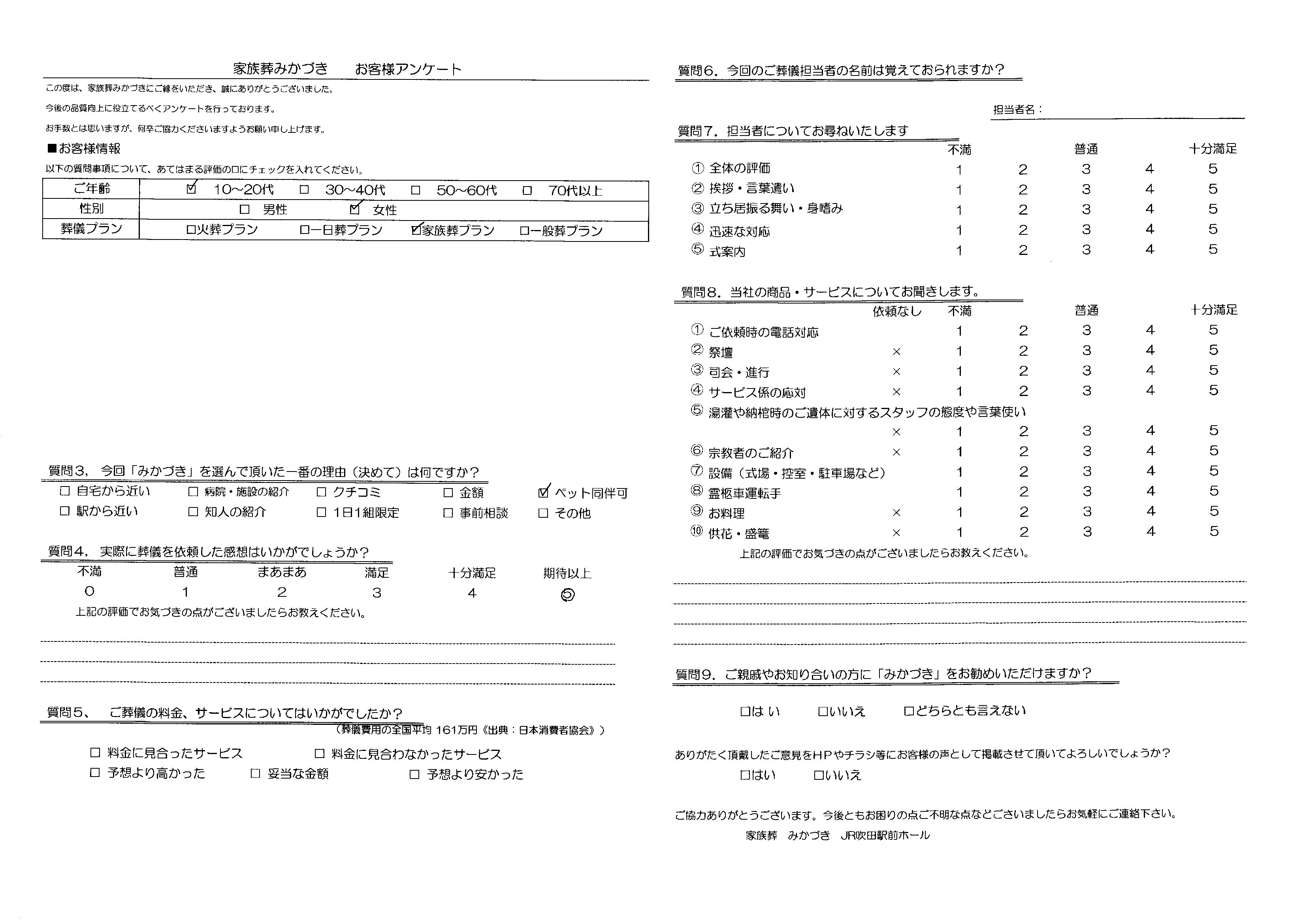 家族葬みかづきでは、葬儀を終えられたご遺族の方にアンケートにご協力いただき、より良いサービスの提供に努めております。