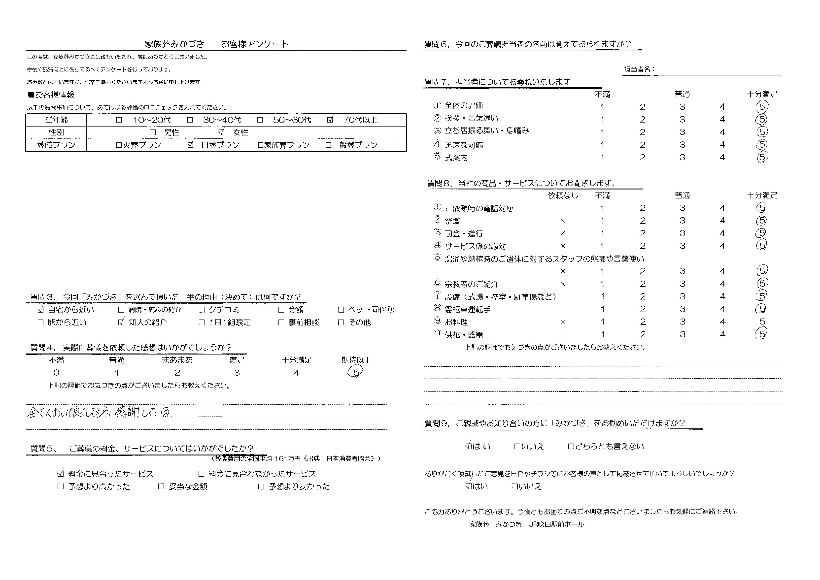 家族葬みかづきでは、葬儀を終えられたご遺族の方にアンケートにご協力いただき、より良いサービスの提供に努めております。